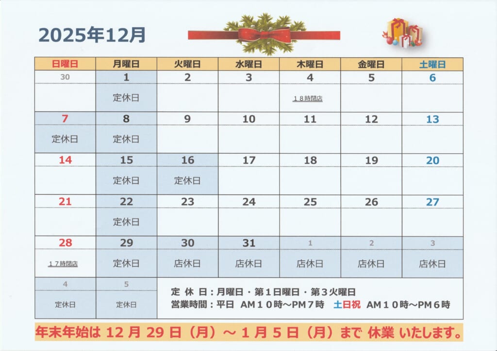 2025年12月1日 / Last updated : 2025年12月2日 bliss お知らせ 12月の営業日のご案内です。 いつもご来店くださいまして 誠にありがとうございます。 12月の営業日のご案内です。 どうぞよろしくお願い申しあげます。 FacebookXBlueskyPocketCopy